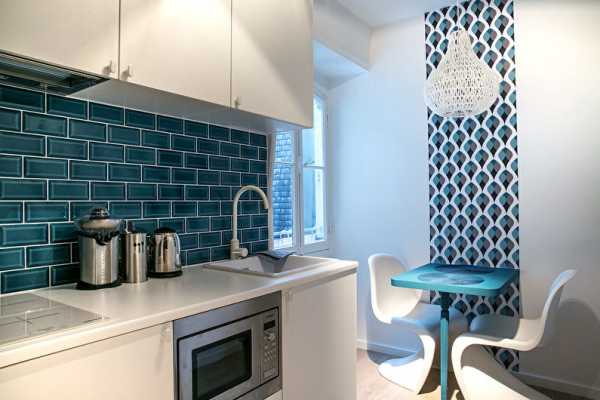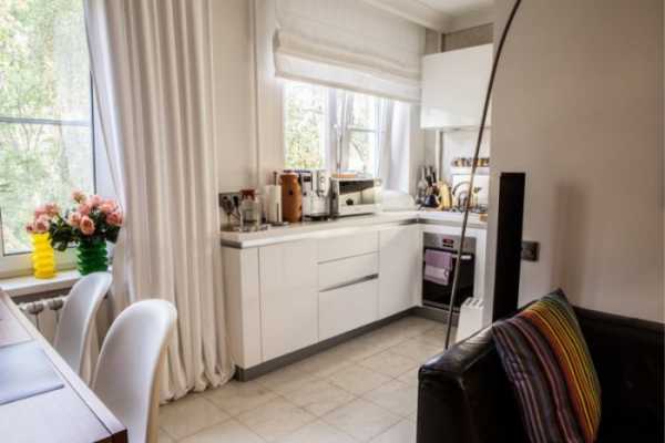 Помещение вмещает всю необходимую технику, но не остается места для столовой. Ее организуют в гостиной.- Без верхних шкафов.