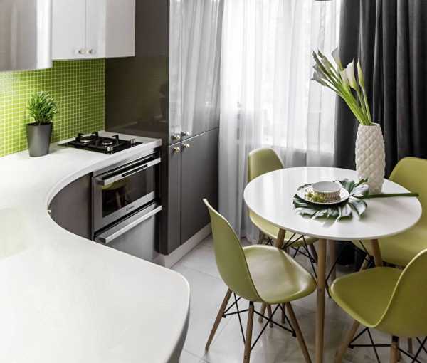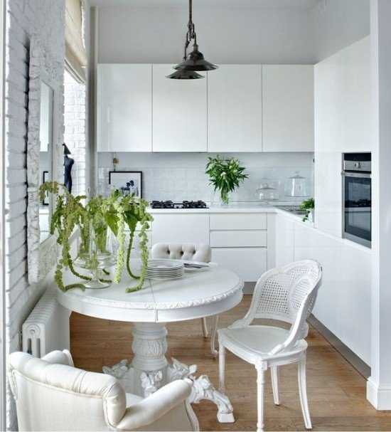 С угловым или линейным гарнитуром можно выделить место под обеденный стол для 2-4 человека.