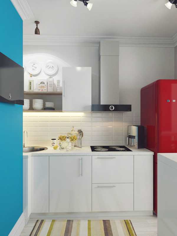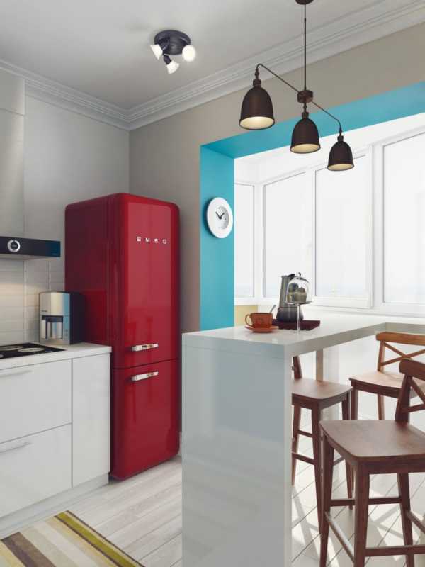 Отдельно стоящий холодильник может выполнять также роль и яркого акцента в интерьере, если он имеет контрастный цвет.