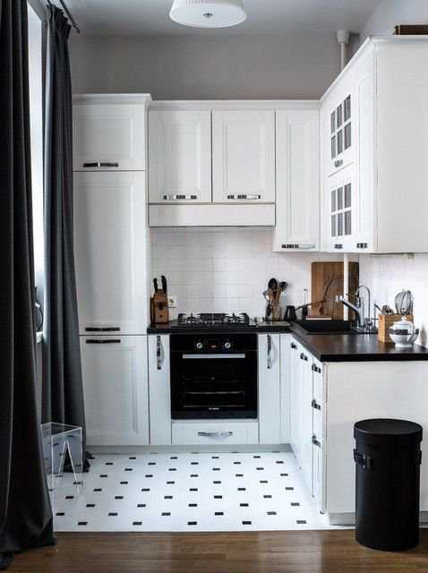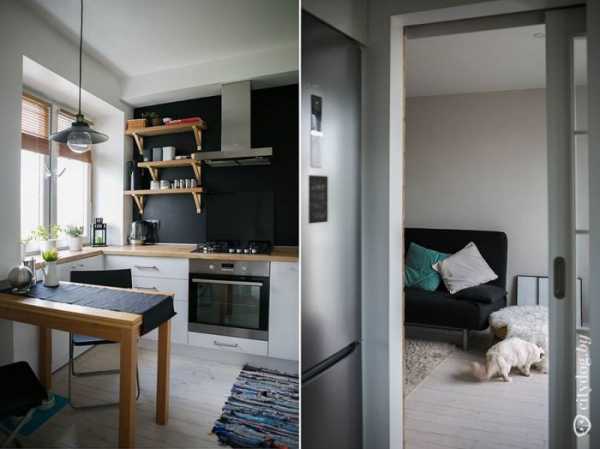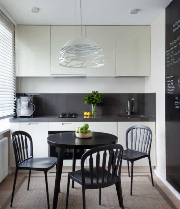Кухня-гостиная с мебелью из ИКЕАПосле перепланировки актуальным становится вопрос зонирования. Выделить несколько главных функциональных центров можно с помощью цвета мебели: например, кухня – белая, обеденная зона (стол и стулья) – черная.