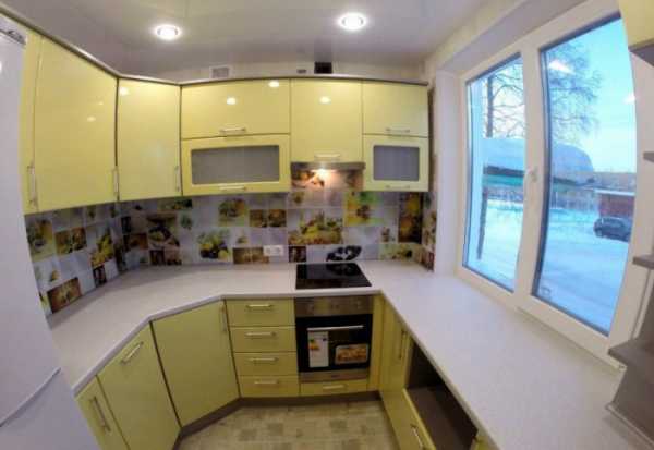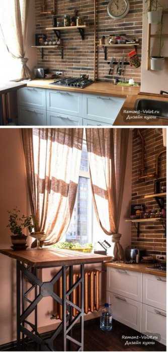 В маленькой кухне П-образный гарнитур предполагает расположение мебели вдоль окна. В данном случае нижний ряд может отсутствовать, а столешница будет установлена на место подоконника после его демонтажа.