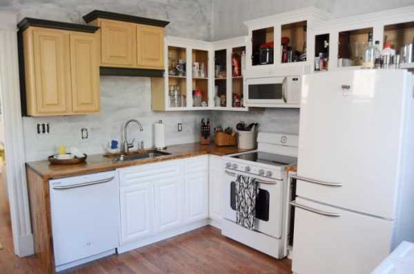Сегодня замена верхних шкафов на открытые полки является одним из модных трендов в дизайне. Но это не всегда практично: требует частную уборку от пыли, становится меньше мест хранения. Зато это значительно облегчит обстановку маленькой кухни. Идея на любителя и имеет место быть.