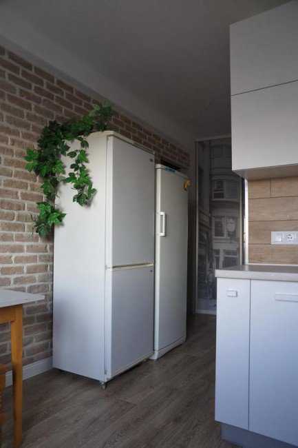 Другой вариант — отказаться от привычной габаритной модели и купить отдельно морозильную камеру, отдельно холодильник и встроить их под столешницу. А если семья небольшая то и компактного низкого варианта «2 в 1» (холодильник + морозилка) вполне хватит. Конечно, и здесь будут свои неудобства. Но обладателям кухни в хрущевке, как ни крути, придётся жертвовать удобством использования ради более свободного пространства, или наоборот.