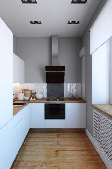 Не самая удачная планировка для маленькой кухни, но имеет место быть, если необходимо много места для хранения. Установить такой гарнитур можно, если кухонное помещение будет являться исключительно местом для готовки, а столовую вы организуете в гостиной.