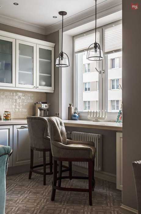 Дизайн в классическом стилеВ П-образной кухне столешница вдоль окна может служить не только рабочей поверхностью, но и обеденной зоной, рассчитанной на 2 человека.