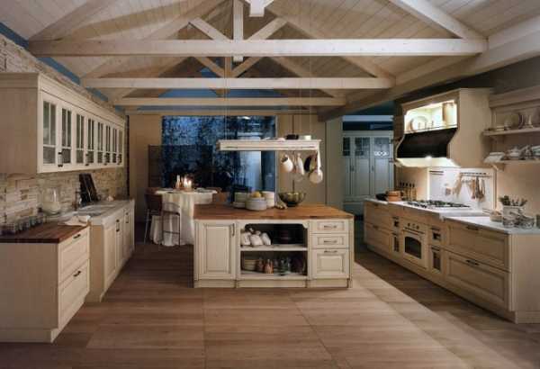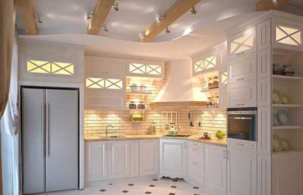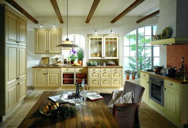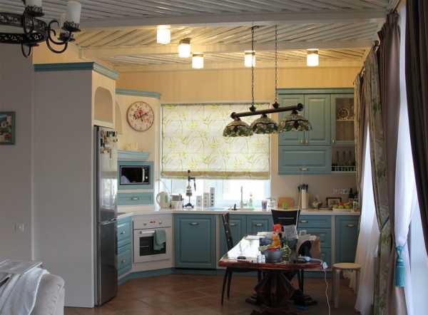 Потолок хорошо сделать деревянным, он может оказаться красивым дизайнерским решением кухни прованс: выкрашенные в характерные цвета декоративные деревянные балки можно установить под потолком, прямо на нем – это будет добавлять особое изящество интерьеру.