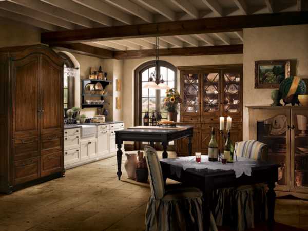 Шкафчики с матовой фурнитурой и массивный стол с резными ножками. Отлично подчеркнет стиль легкая потертость и состаренный вид. Стулья имеют, как правило, высокие спинки и мягкие сидения.