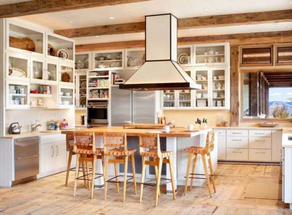 Для отделки стен и пола на кухне выбирают исключительно натуральные материалы с природной фактурой. Это может быть кирпичная кладка, обшитая деревом панель, выкрашенная стана и побеленный потолок.