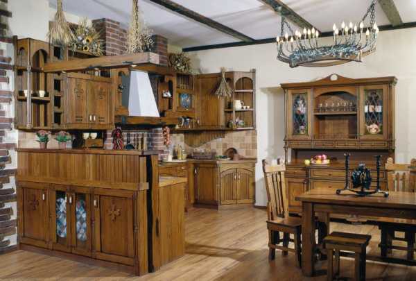 Смешение деревянных предметов мебели с различной отделкой и кованых деталей придают интерьеру нотку старины. Здесь уместны и обеденные столы на резных ножках, и деревенские табуреты с сиденьями на завязочках, и плетеные кресла с подлокотниками.