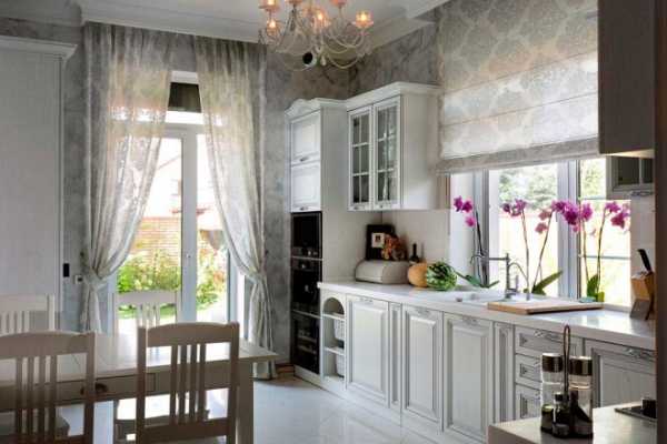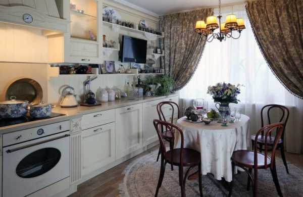 Активно используются шторы и занавески. Нужно выбирать светлые и легкие, чтобы они не мешали проникновению света на кухню.