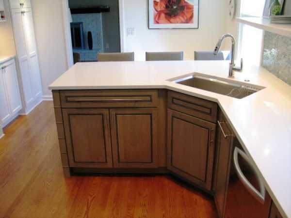 В последнее время покупатели все чаще предпочитают кухонные гарнитуры с угловой раковинойТреугольные компоновки имеют ряд преимуществ: