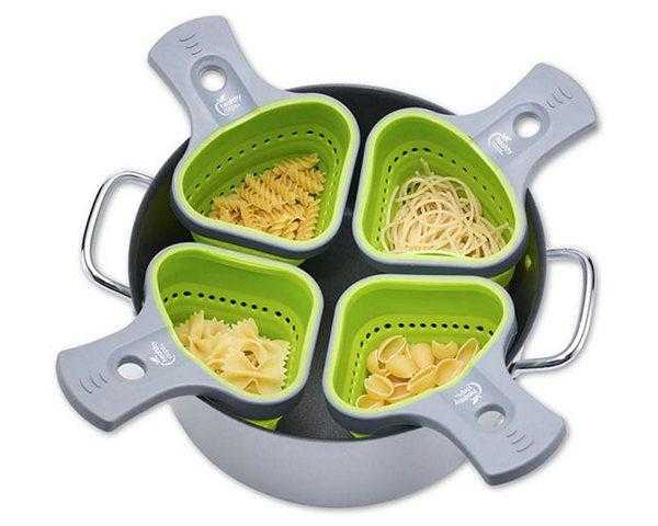 Помимо сковородок, гаджеты для одновременного приготовления продуктов в одной емкости представлены в виде кастрюль. Причем съемные конструкции позволяют варить составляющие элементы блюда разное время. Небольшая насадка в виде сетки позволит слить воду без использования дуршлага, уменьшив объем работы на кухне по мытью посуды.