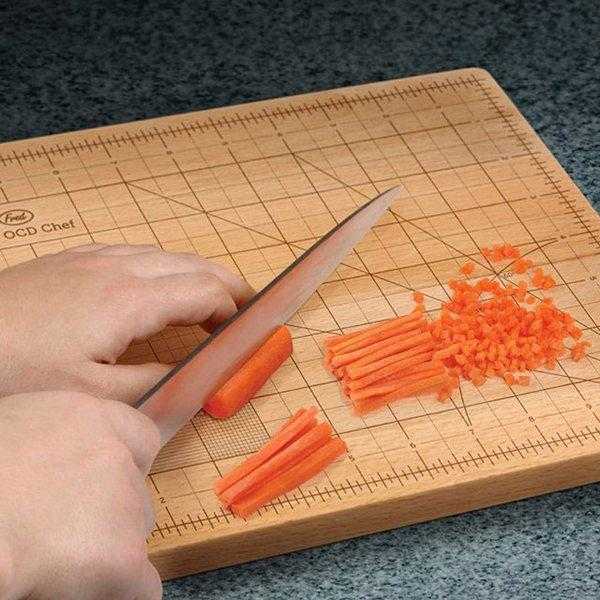 Также вы оцените дощечку с поддоном, который соберет жидкость, выделяющуюся при нарезке мяса. А доска с делениями поможет красиво и симметрично сделать любую нарезку. К примеру, эта креативная досточка для нарезания багета.