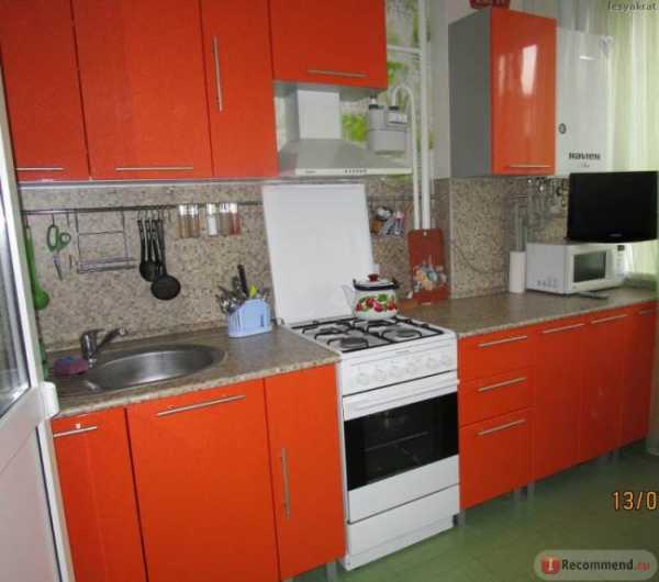 Прямая оранжевая современная кухня длиной 2,4 метра (сам гарнитур, без плиты). Фасады из пленочного МДФ. Стоимость — 1000 долларов.