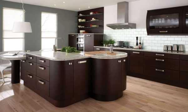 - Островная – самая интересная и удобная модель, установка которой, однако, связана с разнообразными трудностями. В расчет стоит брать то, что, во-первых, это вариант для просторной кухни, а во-вторых, для подводки водопровода, канализации, а то и газопровода к «острову» понадобится полностью переоборудовать помещение.