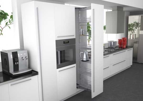 Альтернативой разделению кухни на верхнюю и нижнюю линии могут стать вертикальные шкафы-колонны. Как правило, они представляют собой конструкцию на всю высотку кухни: от пола и до потолка. В таких шкафах удобно хранить как бытовую технику, так и продукты (особенно, если это «стратегические» запасы бакалеи). Но хорошо вписываться в интерьер такая мебель будет только в просторном помещении, в маленьких кухоньках от нее лучше отказаться.