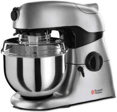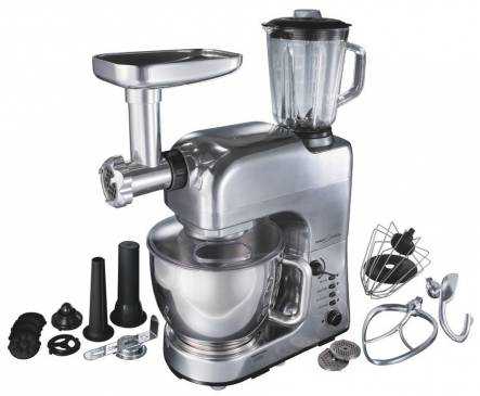 У прибора есть венчик для взбивания, насадка для перемешивания, крюк для теста, 2 толкателя и мясорубка. Также присутствует овощерезка с 3 решетками – крупных размеров терка, мелкая, шинковка. Чаша создана из нержавеющей стали, ее объем равен 4,6 литра. Присутствует крышка для защиты от брызг. Мощность мотора равна 900 Вт, этого достаточно для приготовления пищи на ежедневной основе.