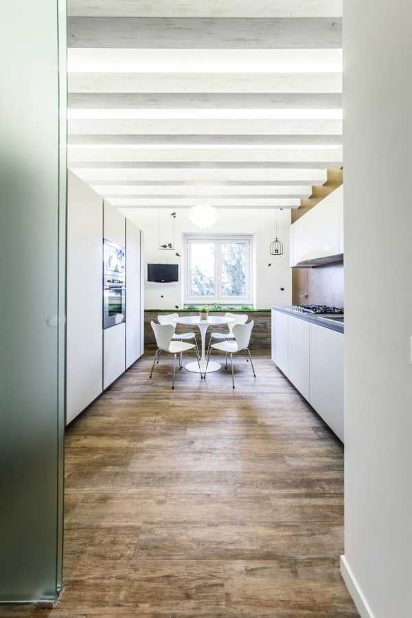 Ярким дизайнерским решением кухни является обеденная зона. Простой белый стол и стулья в ретро стиле располагаются на фоне панно из деревянных шестигранных плиток. Такие пчелиные соты разных оттенков древесины являются модным трендом и отличительной чертой эко стиля. На эргономичной минималистической кухне отсутствуют элементы декора, эстетическую роль на себя берут декоративные деревянные балки перегородки и стен.