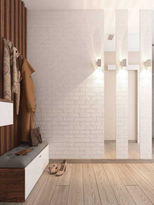 Дизайн коридора сталкивает в себе элементы эко стиля с белоснежной кирпичной стеной в стиле лофт. Меблировка из тёмной древесины не съедает пространство за счёт зеркальной панели. Вертикальные балки прихожей создают неповторимый природный шарм скандинавского интерьера. В эргономичную лавку встроена обувная полка. Монолитную кирпичную стену визуально «разрезают» зеркальные полосы и настенные светильники.