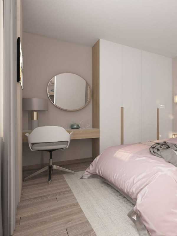 Роль зоны хранения на себя берёт белоснежный встроенный шкаф до потолка, без лишних ручек, он создаёт впечатление однотонной стены, таким образом визуально расширяет пространство. Рядом со шкафом в нише встроена столешница со скрытым ящиком, выполняющая функцию туалетного столика или рабочей зоны. Мелкие элементы декора такие, как настольная лампа, зеркало, стул, подсвечники и вазы, выдержаны в матовой золотистой гамме и отсылают нас к изысканному стилю ар-деко. Светло-бежевый ковёр грубоватой фактуры добавляет комнате уют и характер.