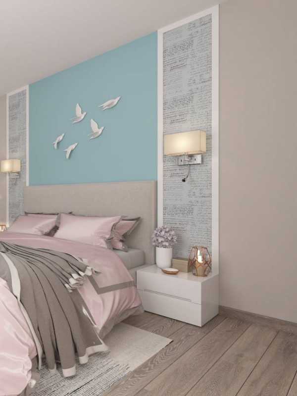 Спальня, как и следует, является самой уютной частью дома. Тёплые серо-бежевые стены в тон напольного покрытия дополнены небесной нишей в зоне кровати. Голубая вставка декорирована объёмными белыми керамическими птицами в полёте. По бокам композиция обрамлена мятными обоями с принтом в виде шрифта, на которых расположены прикроватные светильники тусклого тёплого свечения. По бокам кровати, выбранной в цвет базового цвета интерьера – бежевого, находятся миниатюрные белые тумбочки, которые завершают симметрию композиции.