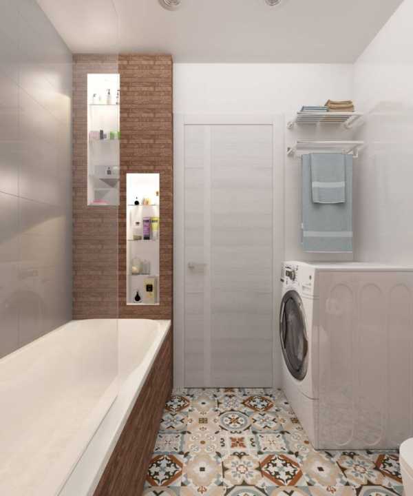 Ванная комната также выполнена в базовом белом цвете, ярким пятном является напольная плитка с этническим орнаментом. Ниша ванной и стена у сан. узла декорированы яркой плиткой; дизайнеры Мossebo прислушиваются к пожеланиям клиента и предоставляют на выбор несколько визуализаций. В первом случае была применена плитка с рисунком древесной фактуры светлого дерева под общий скандинавский стиль интерьера, а во втором – стена стилизована под грубоватые брусья тёмного орешника в стиле рустик. Над ванной организованы ниши с полками для хранения косметических средств. Ниша ванной выполнена в глубоком сером оттенке мокрого асфальта. Раковина-чаша является стилистическим приёмом скандинавского интерьера. Встроенная потолочная подсветка выполнена из герметичных светильников с защитой от влаги и пара.