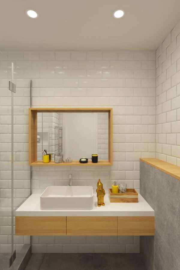 Вместо ванны – душевая кабина, в стене которой сделана ниша для банной косметики. Вокруг зеркала в умывальной зоне – широкая деревянная рамка, ее нижняя часть служит полочкой для зубных щеток и других принадлежностей.