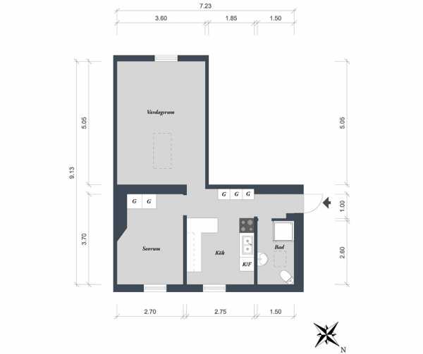 План. У этой Г-образной мансарды ровно посредине идет толстая несущая стена, которая раз и навсегда делит ее на 2 части. Одну из них архитекторы оставили цельной, сделав там большую 18-ти метровую гостиную с роскошным окном верхнего света, а вторую часть архитекторы разделили на несколько фрагментов, выкроив место для спальни, кухни, санузла и прихожей.