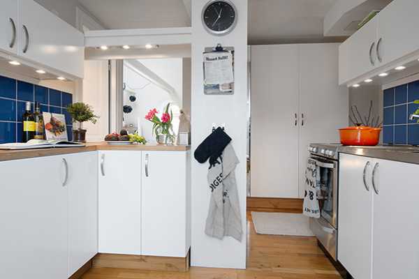 Кухне отведено довольно компактное пространство, чуть меньше восьми метров, но шкафов и техники здесь вместилось более чем достаточно: шкафчики расположены вдоль двух внутренних (единственных прямых) стен и в качестве перегородки-барной стойки. Обратите внимание на простую и очень функциональную деталь: наличие точечного освещения столешницы везде, даже в той части, где расположена стойка, отделяющая кухню от коридора и гостиной.