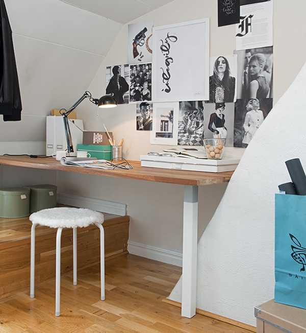 Посмотрите, как изящно здесь расположен рабочий столик. Архитекторы аккуратно вписали его в совершенно безнадежное место – между скосом кровли и выступом стены.