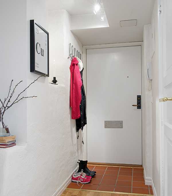 Входная зона имеет небольшой размер, поэтому оборудования здесь мало. Полка для хранения обуви одновременно выполняет роль скамьи для переобувания. Напротив нее на стене смонтированы крючки для верхней одежды – они будут служить вешалкой. Кроме того, имеется подставка под зонты – сверху она закрыта небольшой круглой столешницей, куда можно класть ключи или небольшую сумку.