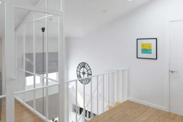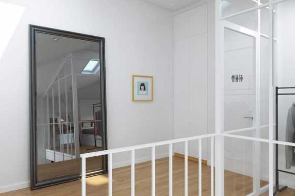 Все дополнительные, утилитарные помещения квартиры выполнены в аналогичном белоснежном варианте отделки стен и использовании светлых пород древесины для напольного покрытия. По лестнице мы поднимаемся в мансардные помещения, где расположены спальни и ванные комнаты.