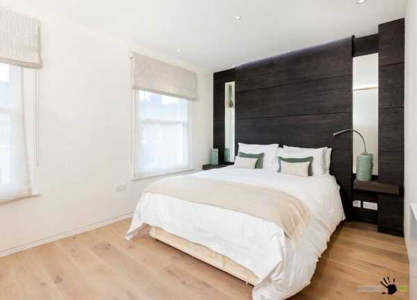 Еще одна спальная комнат выполнена в более контрастном варианте оформления. Облицовка акцентной стены у изголовья кровати с помощью стеновых панелей темного оттенка в сочетании с зеркальными поверхностями позволила создать гармоничный альянс, который не только разнообразил цветовую гамму спальни, но и выделил центральный предмет мебели и фокусный центр помещения – кровать.