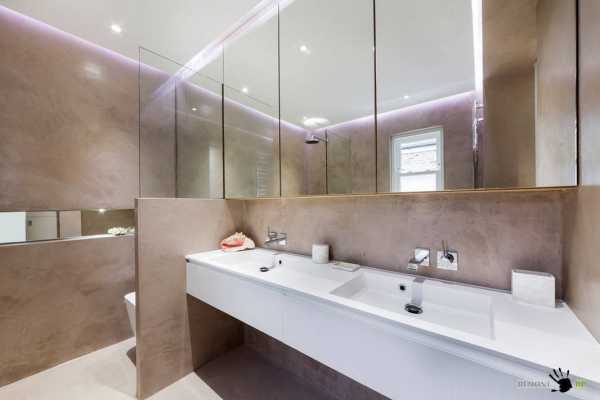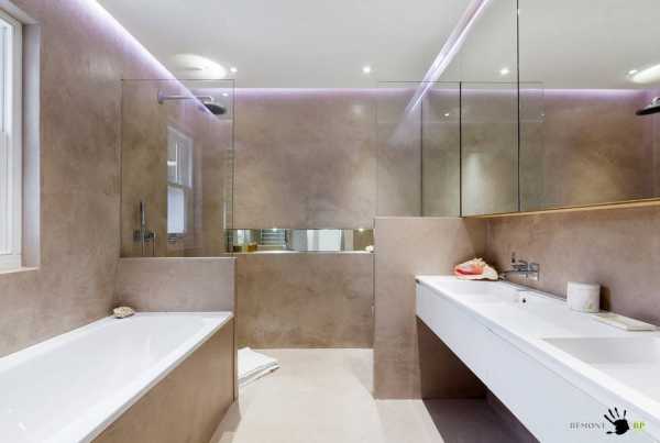 К этой спальне прилегает большая по масштабам и функциональной загруженности ванная комната, выполненная в темно-бежевых тонах. Влагостойкая декоративная штукатурка стала гармоничным фоном для белоснежной сантехники, благодаря использованию зеркальных и стеклянных поверхностей, помещение не только визуально расширилось, но и стало более «легким» с точки зрения зрительного восприятия.