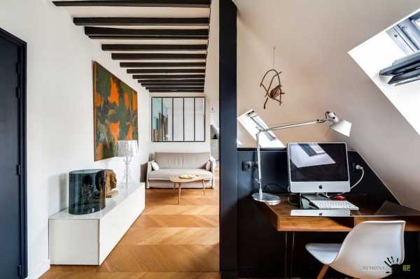 Проникая в парижские апартаменты, расположенные на мансарде, мы оказываемся примерно в центре длинного помещения возле рабочей зоны. Небольшой кабинет разместился в импровизированном уголке, образованном с помощью невысокой перегородки. Для организации современного рабочего места необходимо совсем немного пространства, небольшая консоль на одной опоре, которая крепится к стенам, удобный стул и наличие розетки – мини-кабинет готов.