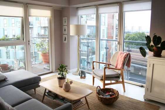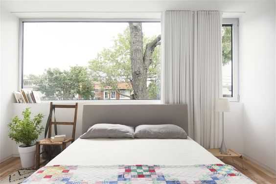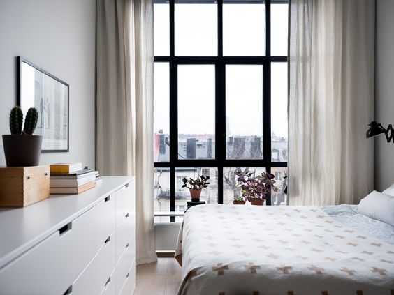 Чтобы всё выглядело гармонично, постарайтесь оставить свободное пространство возле окна. Формы мебели лучше выбирать лаконичные. А вот зелени и живых цветов в таком интерьере слишком много быть не может.