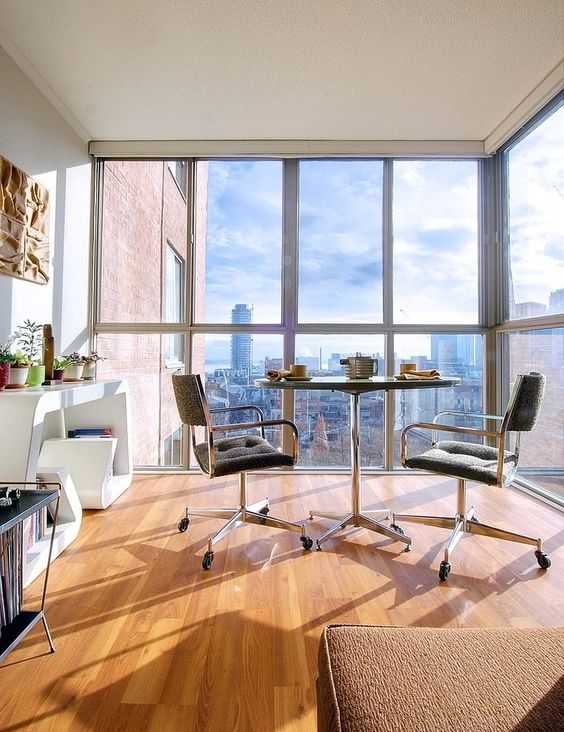 Только обратите внимание, что большинство балконных окон – это не единое полотно, а составная конструкция из двух рам, которые располагаются друг над другом. Нередко разделительная полоса проходит по центру – как раз на уровне глаз, если сидеть на кресле. Таких «мелких», но по итогу важных недочетов нужно стараться избегать.