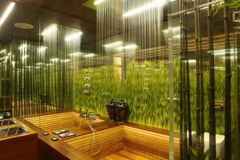 Стены украшают и интересными инсталляциями.Например, вдоль стены или прямо на стену закрепляют стебли бамбука или стволы молодых деревьев. Тут же на стену, между стволами и стеблями, монтируется встроенная подсветка. Эта красота может быть «изолирована» прозрачной панелью из стекла или плексигласа. Получается красивая природная стена.