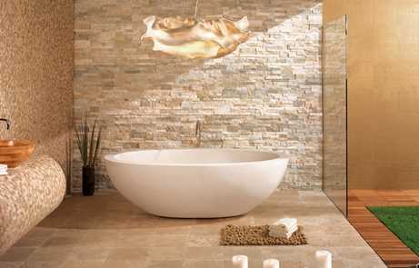 Для ванной подбирают плитку природных оттенков или имитирующую дерево. В эко-ванной будут уместны облицовочный камень или галечная отделка (галька на сетке). Если позволяют средства, можно приобрести деревянную ванну или раковину. Ну а если такой возможности нет, имеется другое решение — закрыть пространство под ванной влагостойким деревом.
