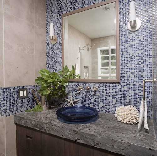 Для отделки ванной подойдет матовый керамогранит, специально обработанное дерево, плитка из натурального камня, шероховатый искусственный камень. При оформлении ванны в эко стиле должно быть минимум глянца и металла. Что касается рисунка, подойдет легкая геометрия, имитация ракушечника, дерева, дикого камня. Цветочная и растительная тематика узоров на стенах будут смотреться очень гармонично и современно.