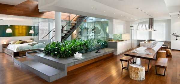 Альтернативой вертикальному озеленению может стать простое использование комнатных растений с умом расположенных в отдельных зонах комнаты.