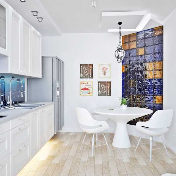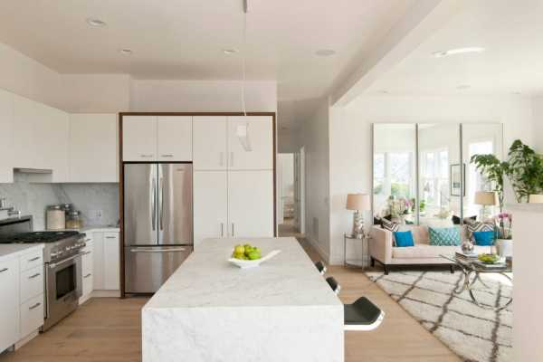 Однотонная отделка – еще один прием моделирования пространства. Белая поверхность стен сливается с фасадами кухонного гарнитура, объединяя все функциональные зоны в целостную композицию.