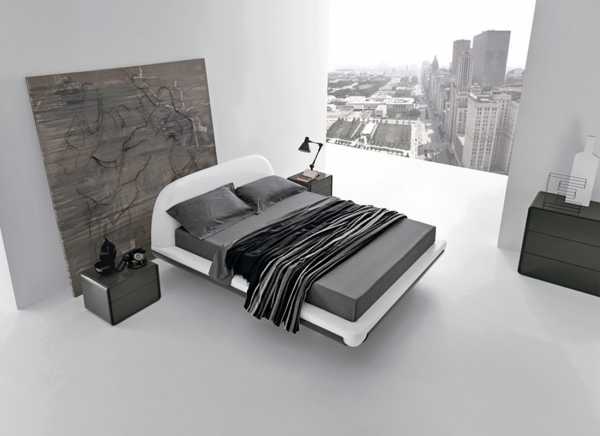 Единственное украшение интерьера – большое абстрактное пристенное панно в изголовье кровати. Интерьер выполнен в изысканной монохромной гамме