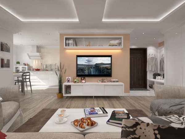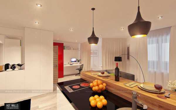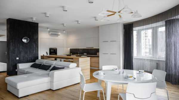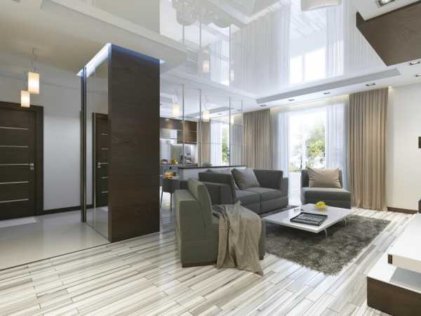 Визуальное разграничение функциональных зон выполнено с помощью двухуровневых потолочных конструкций и осветительных приборов разного дизайна. Дополнительный акцент на гостиной – темный пол из дерева или качественного ламината. В зоне кухни напольное покрытие светлое.