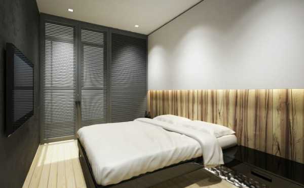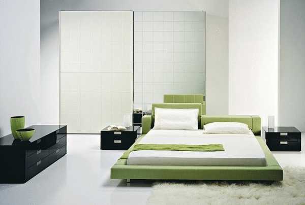 - В спальне оставляем, как можно больше свободного места. Должно быть много света и воздуха в пространстве. Все вещи хранятся строго в шкафах, гардеробах, встроенных подиумах и ящиках. Зонирование производится при помощи ширм (зеркальных или белых). Декор стен ограничивается только часами или черно-белым фото.