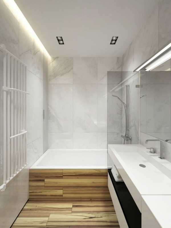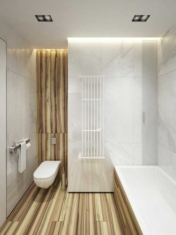 Комбинирование ламината разных цветов в ванной акцентирует внимание на разных зонах помещения.