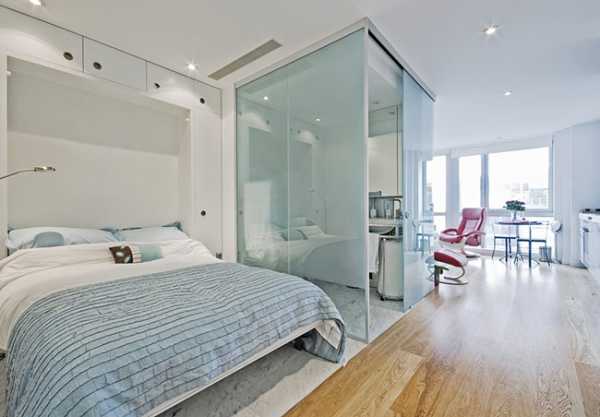 При необходимости оптически увеличить пространство для отделки стен используют материалы белого цвета. Разграничить функциональные зоны можно за счет сочетания разных оттенков или фактур. Перегородка между спальней и гостиной сделана из закаленного стекла.