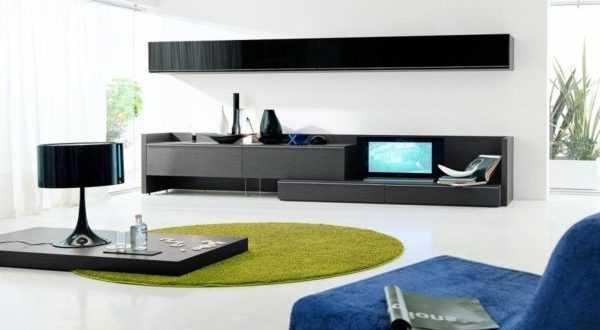 Мебель нужно подбирать геометрической конфигурации – диваны с прямоугольными спинками, кресла и журнальный столик приближенные к кубической форме.