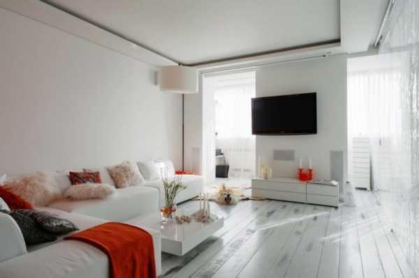- В гостиной можно создать несколько ярких пятен при помощи декоративных подушек на диване, пледа или вазы с апельсинами на журнальном столике.
