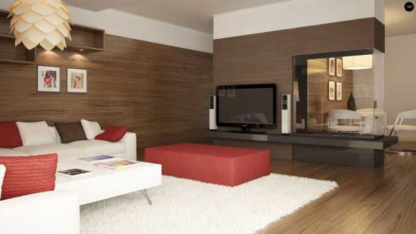 Студия в стиле минимализм выдержана в теплых тонах. Цвет натурального дерева является связующим для всего интерьера в целом. Красные диванные подушки визуально акцентируют внимание на гостиной, на кухне и в столовой преобладает белый цвет.